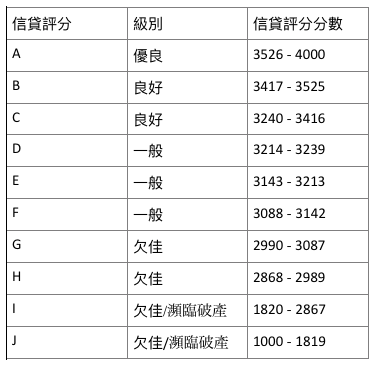 信貸評分由最好的A級至最差的J級一共10級 A至C級屬好的信貸評分;D至H級屬中上至中下,而I及J級則屬於差。