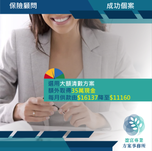 其後申請到大額低息現金解決問題;而且減低每月供款,節省利息開支