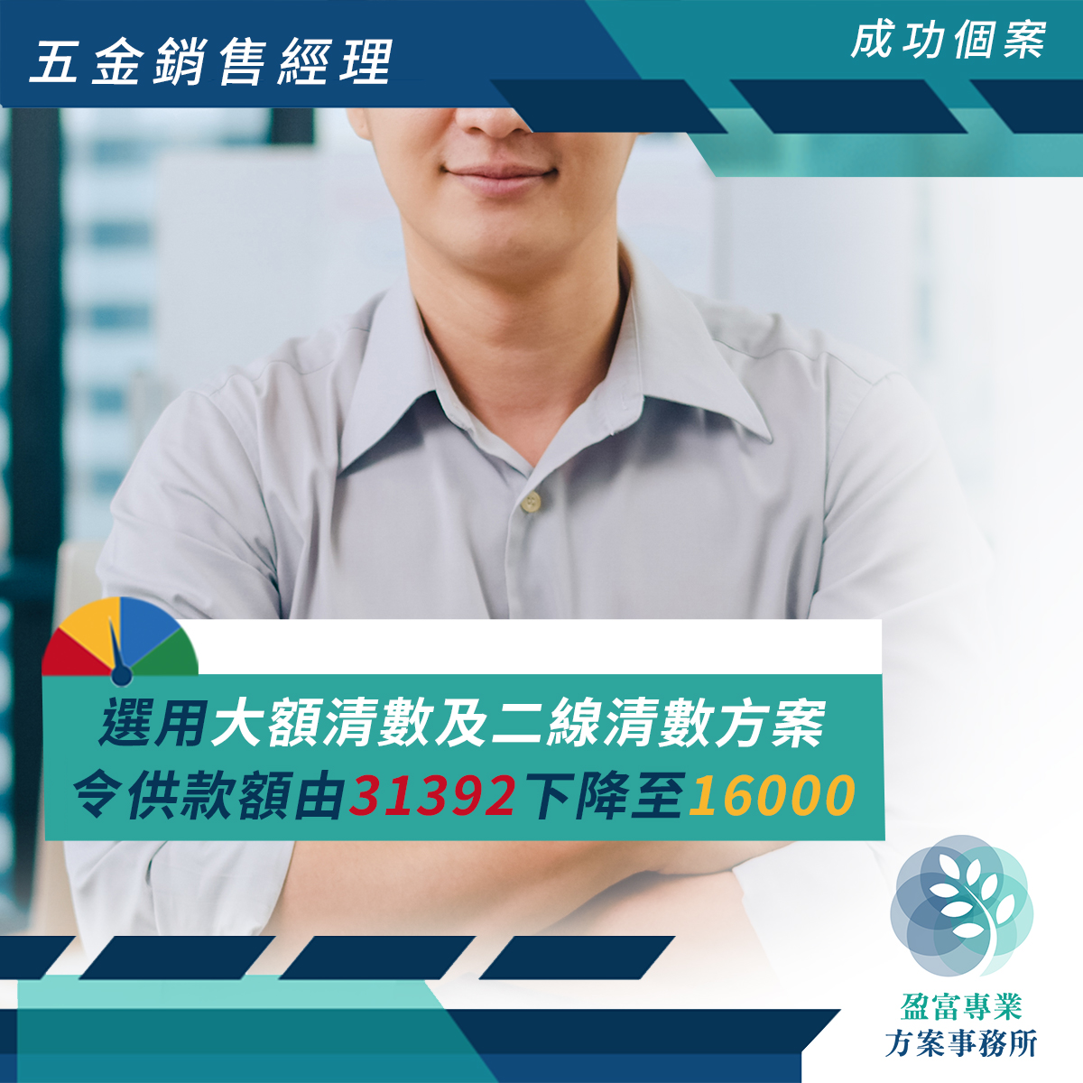 先用清數的方式,令供款額由31392下降至16000;之後TU評分由I提升到C後,進一步一降至9024;同時每月利息開支節省9647元